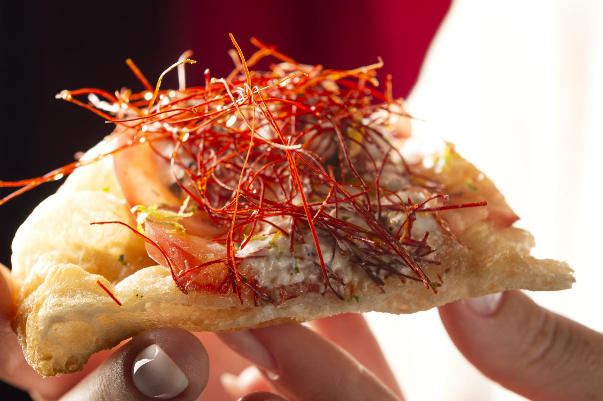NUESTRA MASA NAPOLITANA FRITA CORONADA CON TOMATE NEGRO, BURRATA DESHILACHADA, ANCHOA ITALIANA, HILOS DE CHILI Y RALLADURA DE LIMA