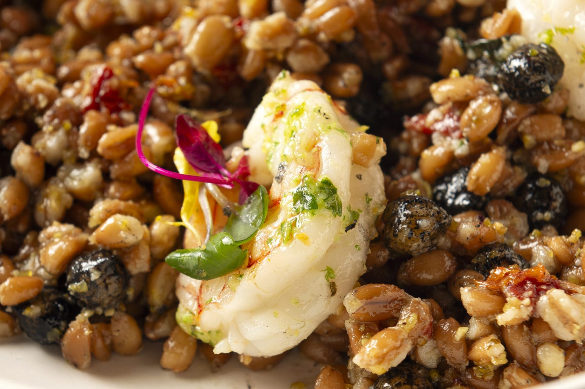 ENSALADA DE ESPELTA ECOLÓGICA CON PESTO VERDE, GARBANZOS NEGROS FRITOS, RALLADURA DE LIMÓN, TOMATE SEMI SECO, ALBAHACA FRESCA Y GAMBITAS A LA PLANCHA.